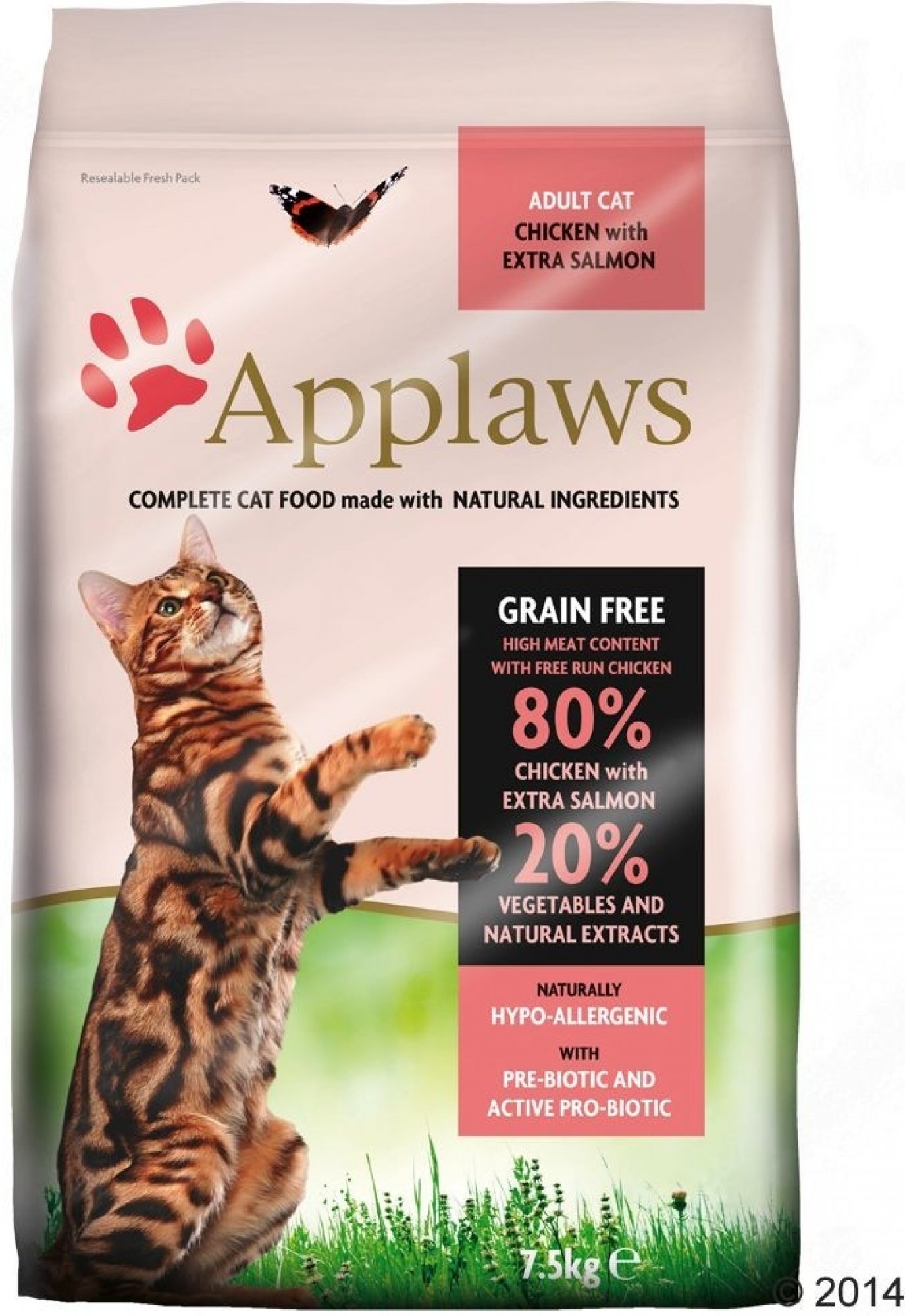 Applaws Adult Cat Chicken & Salmon je kompletní krmivo pro dospělé a starší kočky. Neobsahuje obiloviny, je přirozeně hypoalergenní. Přírodně konzervováno s vitamínem E a rozmarýnovým olejem. Applaws obsahuje přírodní výtažky z brusinek, známé svým přínosem pro zdraví močových cest a prebiotika pomáhající udržovat zdravý trávicí systém. Přírodní omega 3 a omega 6 mastné kyseliny vyživují srst a tím pomáhají vytvářet hedvábný lesk a zároveň zachovat zdravou kůži. Antioxidační formule obsahuje směs přirozeně se vyskytujících antioxidantů selenu a přírodních tokoferolů. Výhody přírodních antioxidantů jsou stále více uznávány, jako důležité pro zdraví a vitalitu kočky.