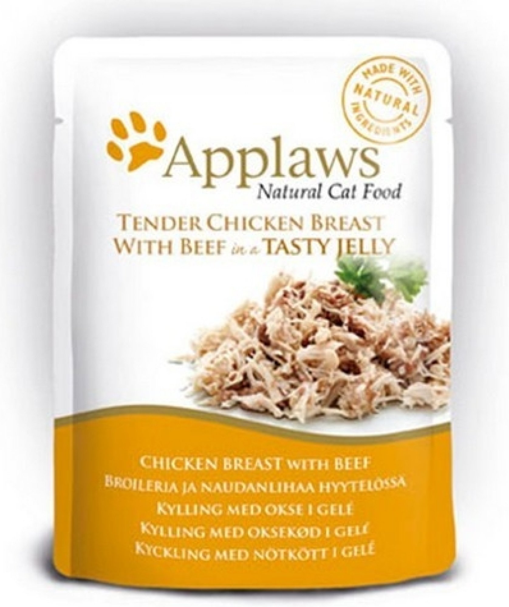 Applaws kapsička kuřecí prsa a hovězí v aspiku. Applaws JELLY - kapsičky pro kočky plné masa v lákavém aspiku.  Doplňkové krmivo pro dospělé kočky z čistě přírodních surovin.  Základem je 55 % masa z kuřecích prsou nebo 55 % masa z tuňáka v celých kouscích a vybraná masíčka pro atraktivní chuť a pro... celý popis