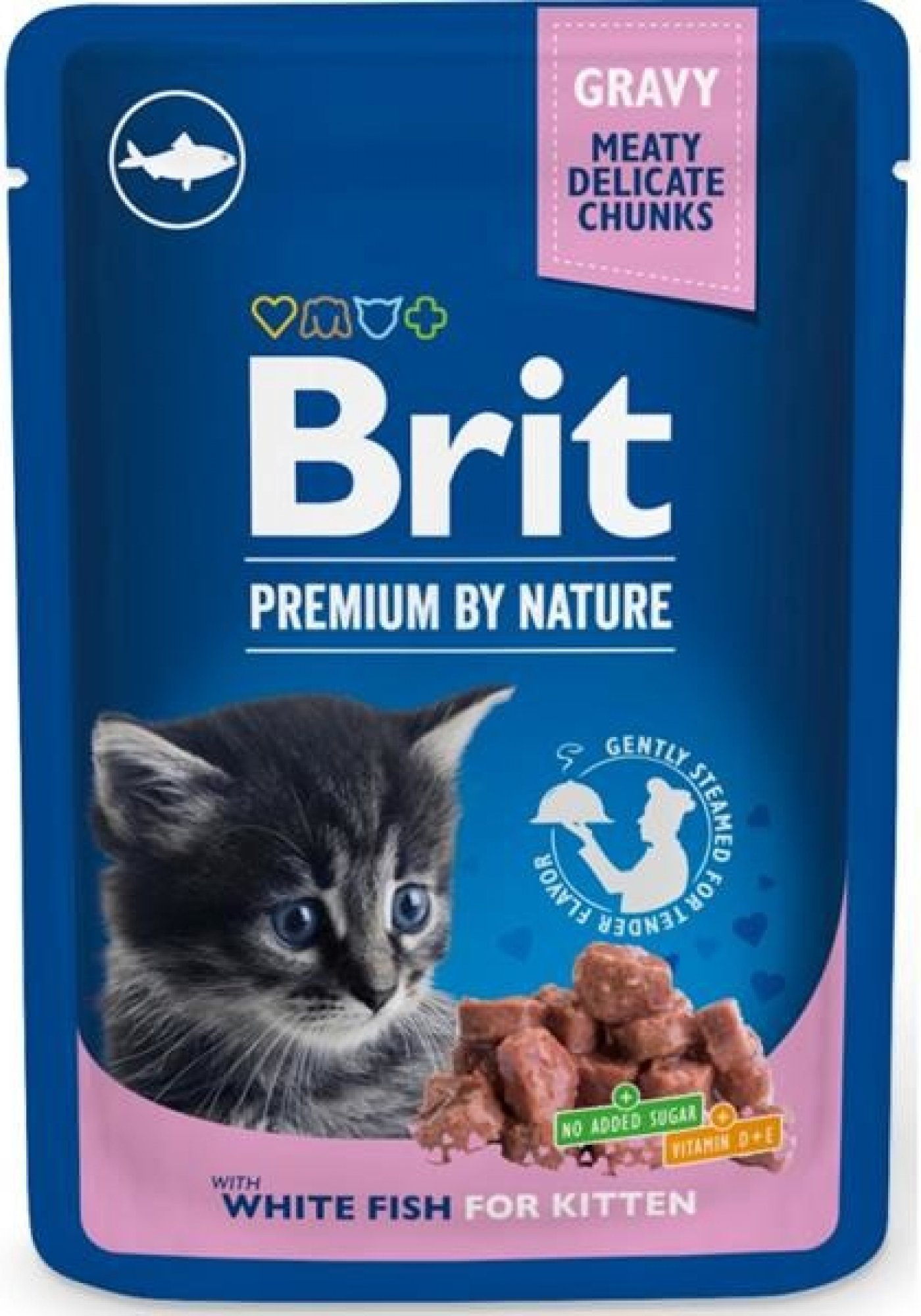 Kočičí masová kapsička pro krásu a zdraví Brit Premium s masem z bílé ryby v jemné omáčce. Kompletní mokré krmivo pro koťata a mladé kočky. Varianty příchutí respektují přirozené preference koček i jejich nutriční potřeby z hlediska fáze věku či speciální výživy. Delikátní šťáva podtrhuje chuť masových kousků a dodá kočce potřebné tekutiny. Prémiová kapsička pro kočky se skládá ze šťavnatého masa a šťávy, která podtrhuje chuť onoho masa, které v ní "plave". Výroba těchto dobrot spočívá ve vaření v páře. Tato metoda zachovává originální chuť a vůni masa. Kapsička neobsahuje přidaná barviva ani konzervanty.