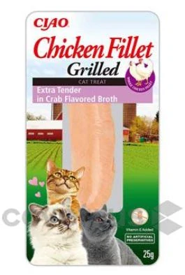 100% extra křehké kuřecí filátko v poctivém krabím vývaru. Šťavnatý grilovaný filet z farmářského kuřete pro gurmánský zážitek. Neodolatelná chuť a vůně poctivého masa. Křehké filátko potěší vaší kočičku jako pamlsek nebo jako doplněk běžné krmné dávky. Lahodný vývar skvěle ochutí jakékoliv granule a pomůže zvýšit chuť k jídlu. Nízký obsah kalorií. Bez obilovin, bez obsahu umělých barviv, bez chemických dochucovadel a bez aromat. Kočičí grain free pochoutka Chicken Fillet je navíc obohacena o 100% přírodní extrakt ze zeleného čaje.