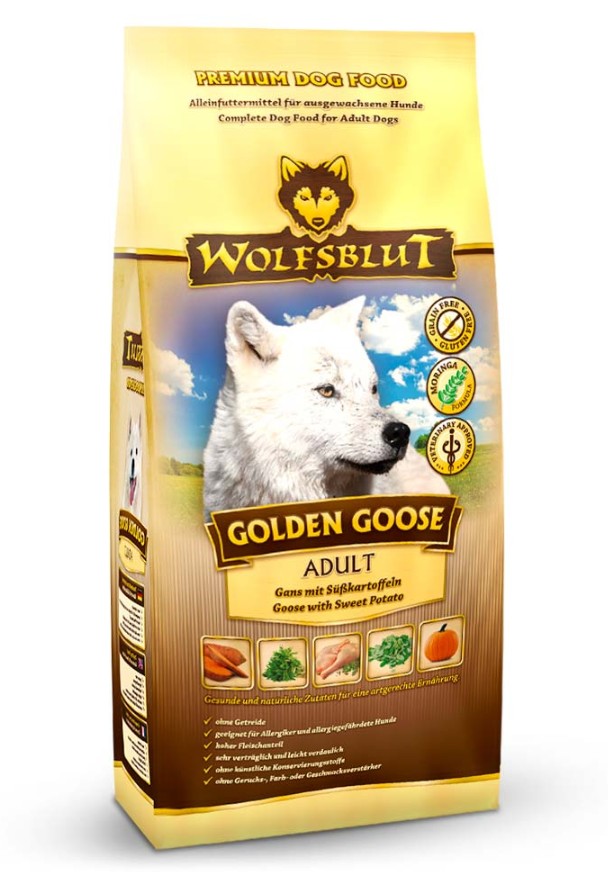 Vlci loví svou kořist od Skalistých hor Severní Ameriky, arktické tundry, hor a lesů Evropy až po pouště a stepi střední Asie. To jim dodává maso a vnitřnosti bohaté na živiny, ale také zeleninu, ovoce, bobule, kořeny a bylinky z obsahu žaludku kořisti. Obilí zde není zahrnuto. Vlk tak přijímá potřebné vitamíny, minerály, stopové prvky, enzymy a druhotné rostlinné látky. Vzhledem k tomu, že vlk je předkem všech psů, naše suché krmivo pro psy Wolfsblut je založeno na přirozených stravovacích návycích vlka. Obsahuje hodně masa nebo ryb v kombinaci se superpotravinami, které obsahují hodnotné ingredience – stejně jako v přírodě, bez obilovin. Náš výběr výjimečných druhů masa a superpotravin bohatých na živiny vychází z vlčích biotopů a jejich pestré stravy. Wolfsblut nabízí každému psovi druhově vhodnou a originální stravu a díky rozmanitosti odrůd si každý najde něco, co snese. Receptura na suché krmivo GOLDEN GOOSE kombinuje výživu vlků s nejnovějšími vědeckými poznatky o správné výživě psů.