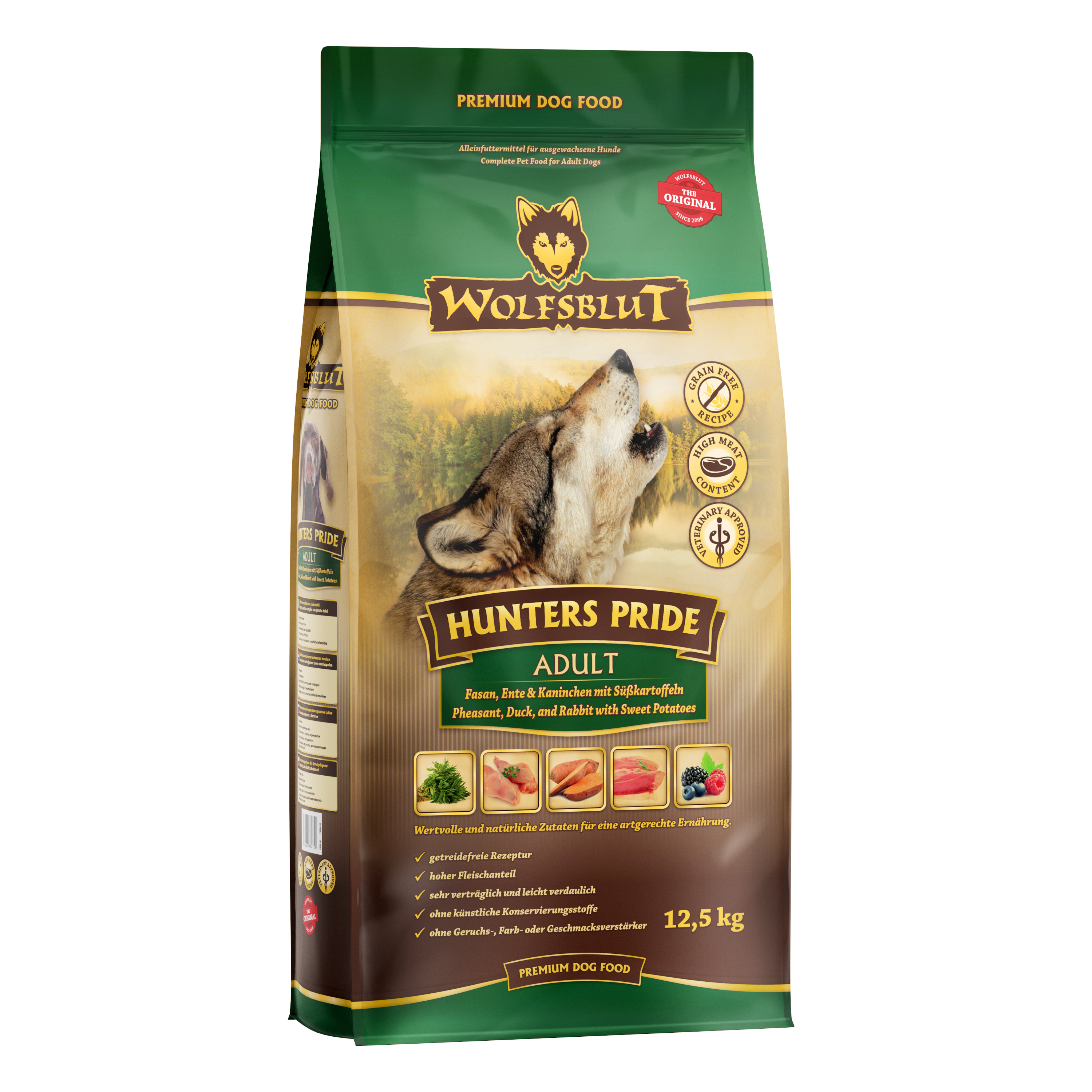 Vlci loví svou kořist od Skalistých hor Severní Ameriky, arktické tundry, hor a lesů Evropy až po pouště a stepi střední Asie. To jim dodává maso a vnitřnosti bohaté na živiny, ale také zeleninu, ovoce, bobule, kořeny a bylinky z obsahu žaludku kořisti. Obilí zde není zahrnuto. Vlk tak přijímá potřebné vitamíny, minerály, stopové prvky, enzymy a druhotné rostlinné látky. Vzhledem k tomu, že vlk je předkem všech psů, naše suché krmivo pro psy Wolfsblut je založeno na přirozených stravovacích návycích vlka. Obsahuje hodně masa nebo ryb v kombinaci se superpotravinami, které obsahují hodnotné ingredience – stejně jako v přírodě, bez obilovin. Náš výběr výjimečných druhů masa a superpotravin bohatých na živiny vychází z vlčích biotopů a jejich pestré stravy. Wolfsblut nabízí každému psovi druhově vhodnou a originální stravu a díky rozmanitosti odrůd si každý najde něco, co snese. Suché krmivo HUNTERS PRIDE kombinuje výživu vlků s nejnovějšími vědeckými poznatky o správné výživě psů.