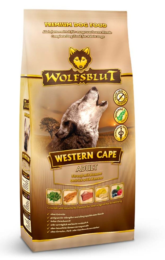 Vlci loví svou kořist od Skalistých hor Severní Ameriky, arktické tundry, hor a lesů Evropy až po pouště a stepi střední Asie. To jim dodává maso a vnitřnosti bohaté na živiny, ale také zeleninu, ovoce, bobule, kořeny a bylinky z obsahu žaludku kořisti. Obilí zde není zahrnuto. Vlk tak přijímá potřebné vitamíny, minerály, stopové prvky, enzymy a druhotné rostlinné látky. Vzhledem k tomu, že vlk je předkem všech psů, naše suché krmivo pro psy Wolfsblut je založeno na přirozených stravovacích návycích vlka. Obsahuje hodně masa v kombinaci se superpotravinami, které obsahují hodnotné ingredience – stejně jako v přírodě, bez jakýchkoliv obilovin. Náš výběr výjimečných druhů masa a superpotravin bohatých na živiny vychází z vlčích biotopů a jejich pestré stravy. Wolfsblut nabízí každému psovi druhově vhodnou a originální stravu a díky rozmanitosti odrůd si každý najde něco, co snese. Receptura suchého krmiva WESTERN CAPE kombinuje výživu vlků s nejnovějšími vědeckými poznatky o správné výživě psů.
