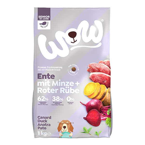 Kachní maso má výraznou chuť a vysoký obsah bílkovin. Kompletní krmivo pro starší psy, aby jim chutnalo a snadno se trávilo. WOW granule Kachna Senior je kompletní přírodní suché krmivo pro dospělé a starší psy s vysokým obsahem kvalitních bílkovin z kachního masa, se špenátem a další zeleninou, obohacené o vitamíny a stopové prvky, za studena lisované oleje a další zdraví prospěšné přísady, jako jsou brusinky pro zdraví močových cest nebo slávka zelenoústá pro podporu kloubů.